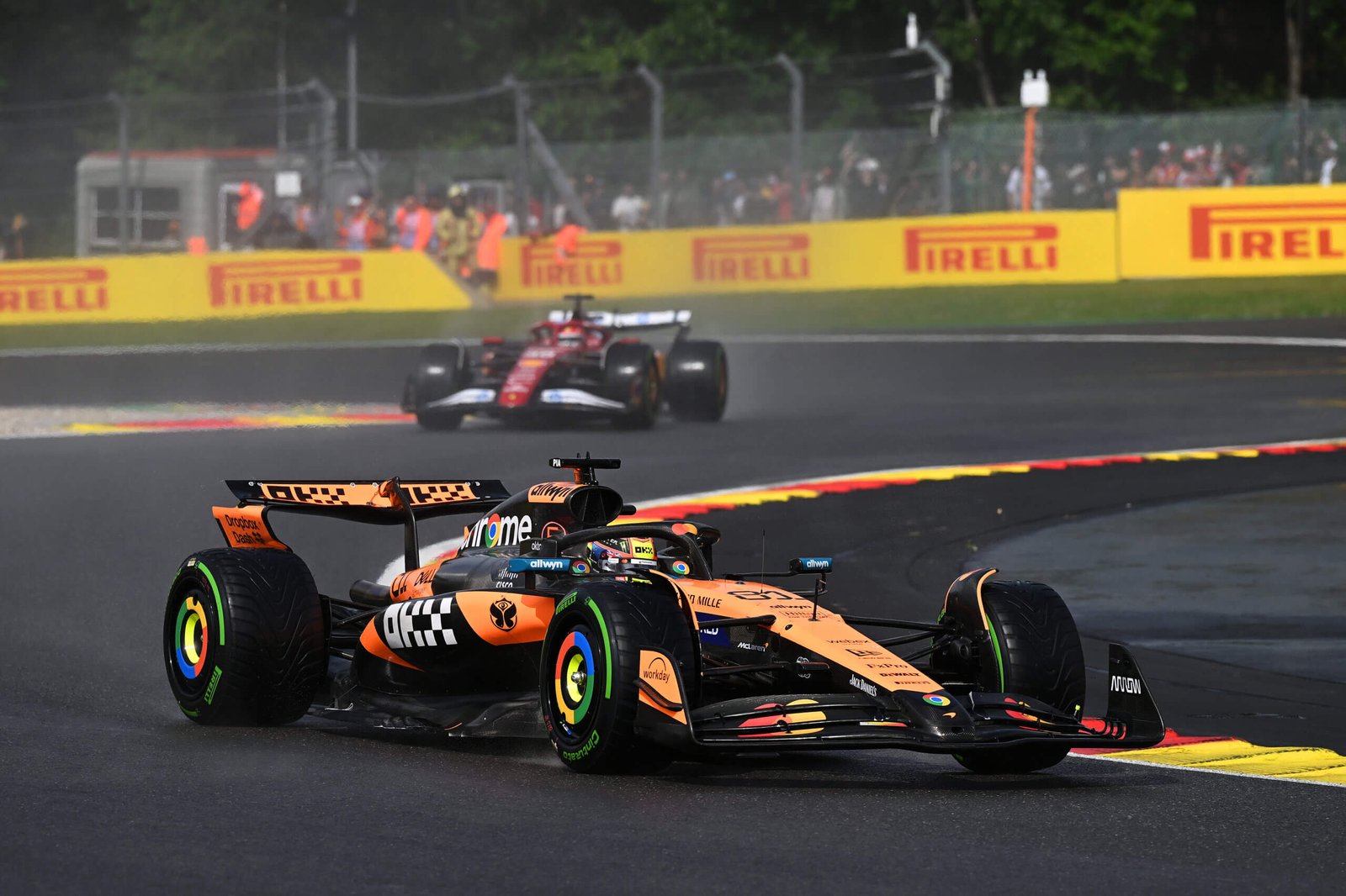 Foi neste momento de pista livre que Piastri atacou o seu companheiro de equipe e conseguiu assumir a ponta. A McLaren então optou por uma estratégia diferente para os seus dois pilotos, Piastri seguiu o restante do pelotão usando os compostos médios – no momento que a pista estava mais seca. Por outro lado, Norris foi liberado com os pneus duros, pensando em uma corrida de apenas uma parada e ganhando um pouco mais de performance no final da corrida.
