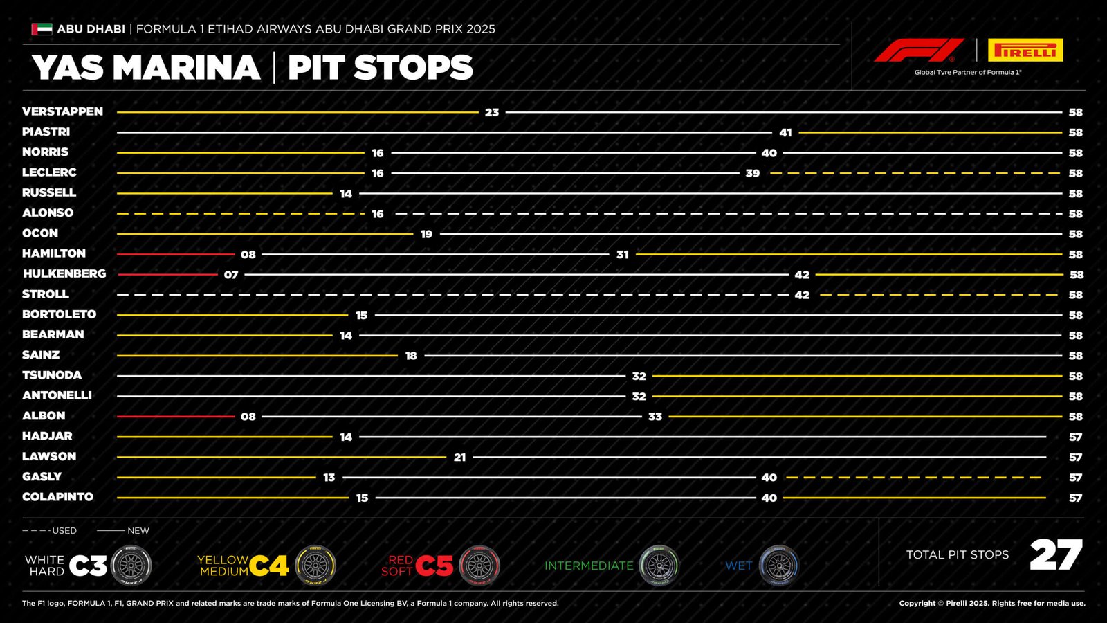 De fato, os três primeiros colocados fizeram apostas distintas, apesar de Max Verstappen e Lando Norris iniciarem a corrida com os pneus médios, Oscar Piastri foi liberado com os pneus duros. O neerlandês seguiu a cartilha, fez o primeiro stint de médios até a volta 23 e ao instalar os pneus duros, manteve o seu ritmo até o final.