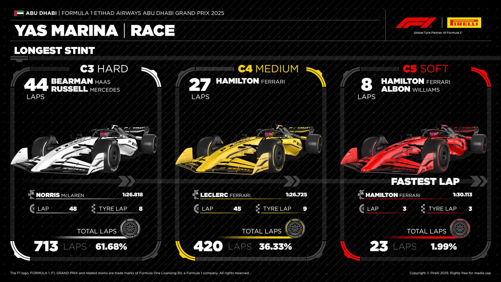 “Entre os pilotos que optaram pela estratégia alternativa, destaca-se o recém-coroado campeão Lando Norris. Ele escolheu uma estratégia de duas paradas, provavelmente motivado pela parada extra nos boxes de Charles Leclerc, da Ferrari, utilizando os dois jogos de pneus duros novos que a McLaren havia guardado para a corrida.”