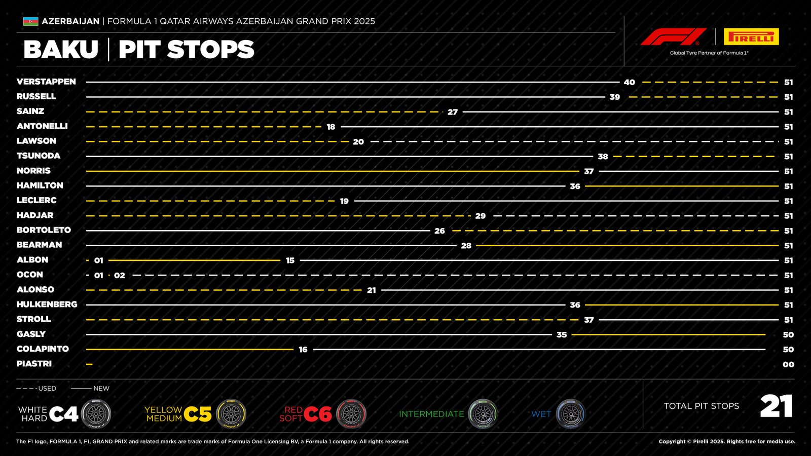 Também pararam cedo Andrea Kimi Antonelli (para limpar o caminho para George Russell), Charles Leclerc, Liam Lawson e Fernando Alonso, nas voltas 18,19, 20 e 21 respectivamente, todos por iniciarem a prova com os médios.