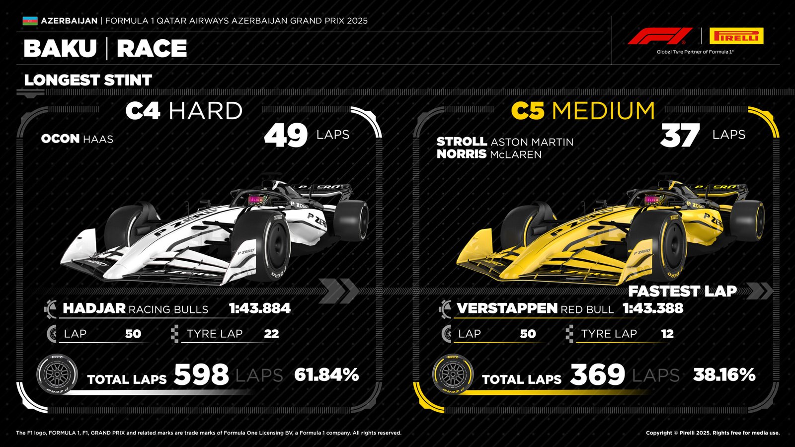 Em Baku, no entanto, surgiu um desafio particular. O pneu duro precisava de até 10 voltas para alcançar a temperatura ideal, e exigir demais dele antes desse ponto poderia comprometer sua integridade. Quando finalmente entrava na janela de funcionamento, apresentava pouquíssima degradação.