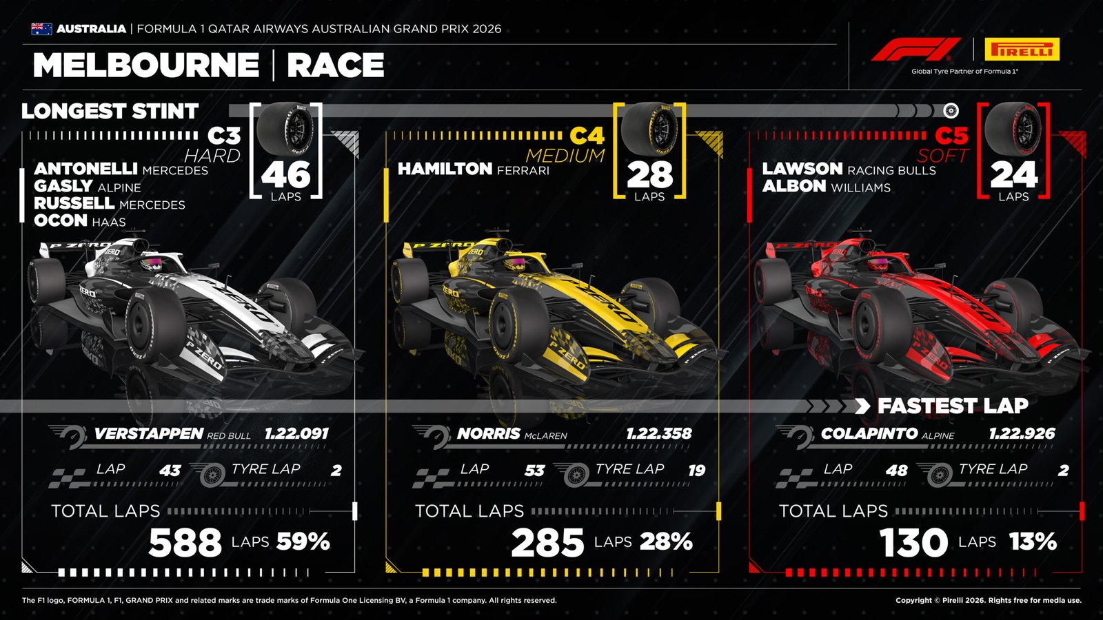O GP da Austrália foi pautado na estratégia de apenas uma parada. Quando a corrida começou no circuito do Albert Park, alguns times acreditavam que seria necessário fazer uma segunda troca de pneus, mas com a evolução da prova, eles conseguiram se limitar em uma troca.
