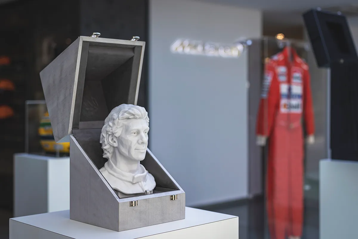 Cada busto da “Victory Edition” é meticulosamente esculpido em alumínio facetado, capturando a essência da vitória correspondente. O brilho do alumínio reflete a intensidade e a paixão que Senna trazia para cada corrida, tornando cada peça uma verdadeira obra de arte.