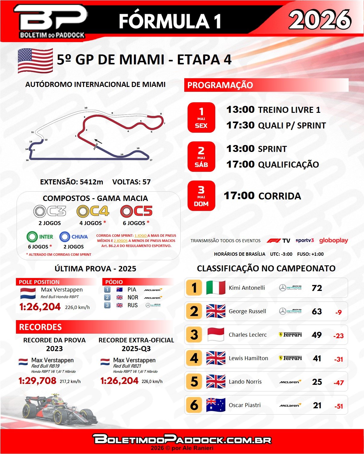 Quando a Fórmula 1 embarcou para essa pausa não programada, Andrea Kimi Antonelli assumiu a liderança do campeonato. O jovem italiano conseguiu faturar 72 pontos, após emplacar duas vitórias seguidas – China e Japão.