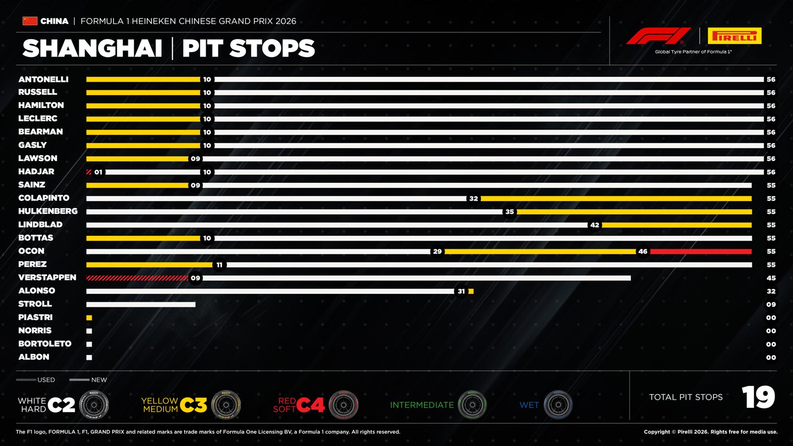 Os compostos duros também foram usados na largada por Franco Colapinto, Nico Hülkenberg, Arvid Lindblad e Esteban Ocon.