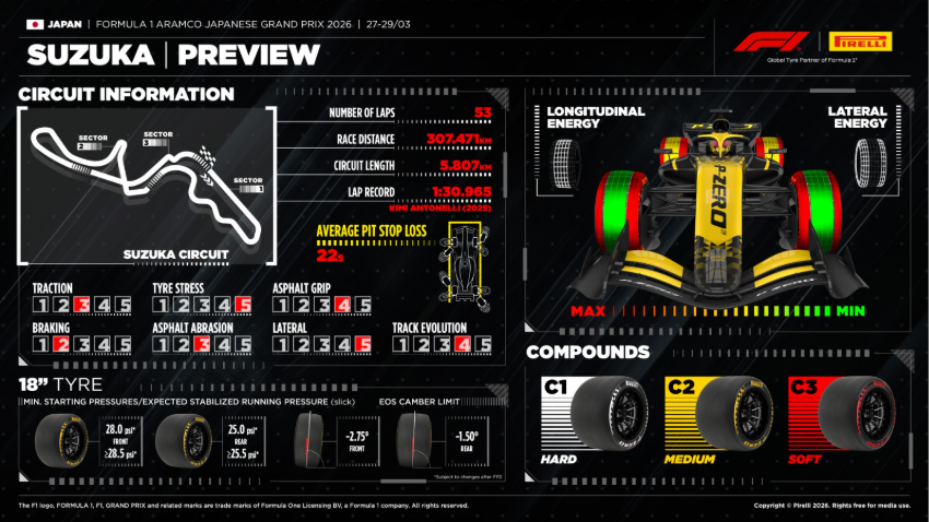 As forças e cargas geradas pelas contínuas mudanças de direção, combinadas com trechos de alta velocidade, fazem da pista japonesa, uma das mais difíceis para os pneus. Os compostos selecionados para o evento, são da gama mais dura: C1 (duro – faixa branca), C2 (médio – faixa amarela) e C3 (macio – faixa vermelha). Com essa escolha, a Pirelli usará pelo primeiro fim de semana do ano o pneu C1, que não fez parte das duas primeiras provas.