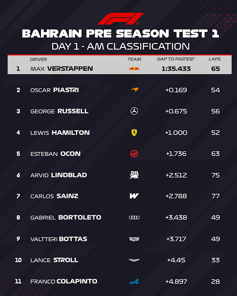 A manhã de testes foi encerrada com Verstappen ainda na liderança, completando 65 voltas. Na segunda colocação estava Oscar Piastri com a marca de 1m35s602 como o seu melhor registro pela manhã e 54 voltas completadas.
