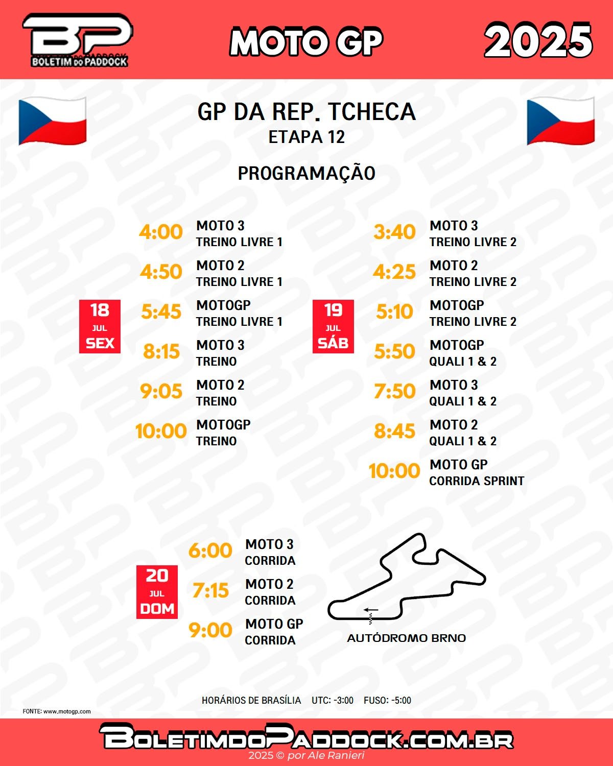 Neste fim de semana a MotoGP desembarca na Repúblic Tcheca, para o duelo da 12ª etapa da temporada 2025. A prova é a última antes das férias de verão, depois a categoria só retornará entre os dias 15 e 17 de agosto para o duelo na Áustria.
