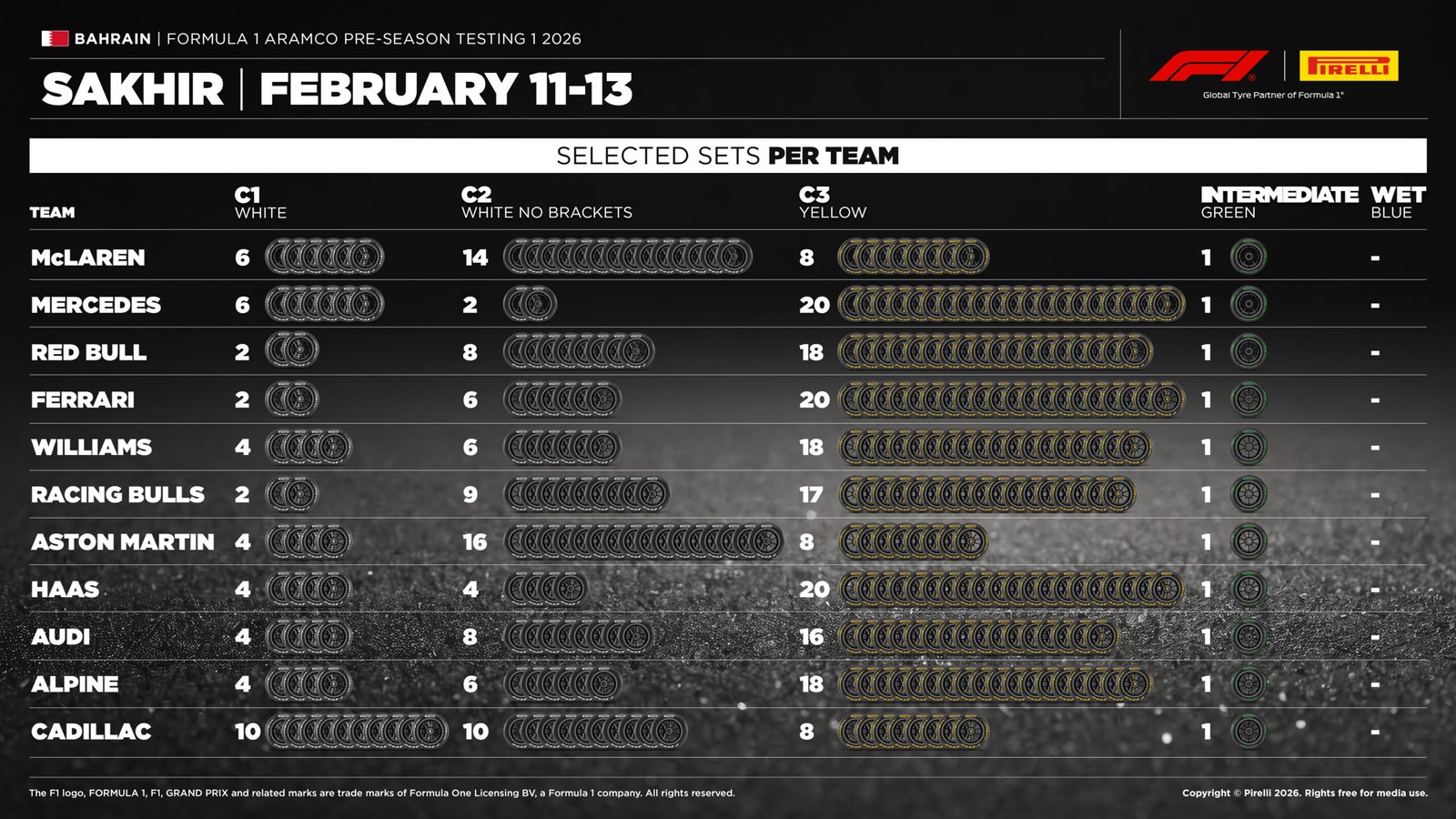 Nesta quarta-feira (11) será iniciado os testes de pré-temporada no Bahrein, desta forma a Pirelli reservou os pneus que serão usados ao longo das sessões.