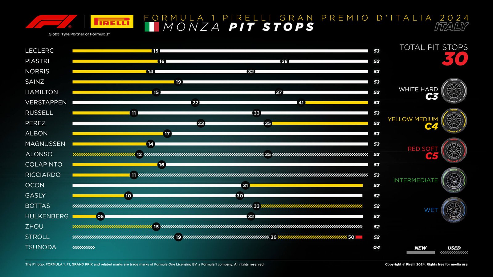 Os três pilotos que subiram ao pódio – Charles Leclerc, Oscar Piastri e Lando Norris – largaram com o composto C4. Leclerc, vencedor da prova, fez apenas uma troca: colocou os pneus duros (C3) na volta 15 e seguiu até a bandeirada. Já a dupla da McLaren precisou realizar uma segunda parada, novamente para pneus duros.