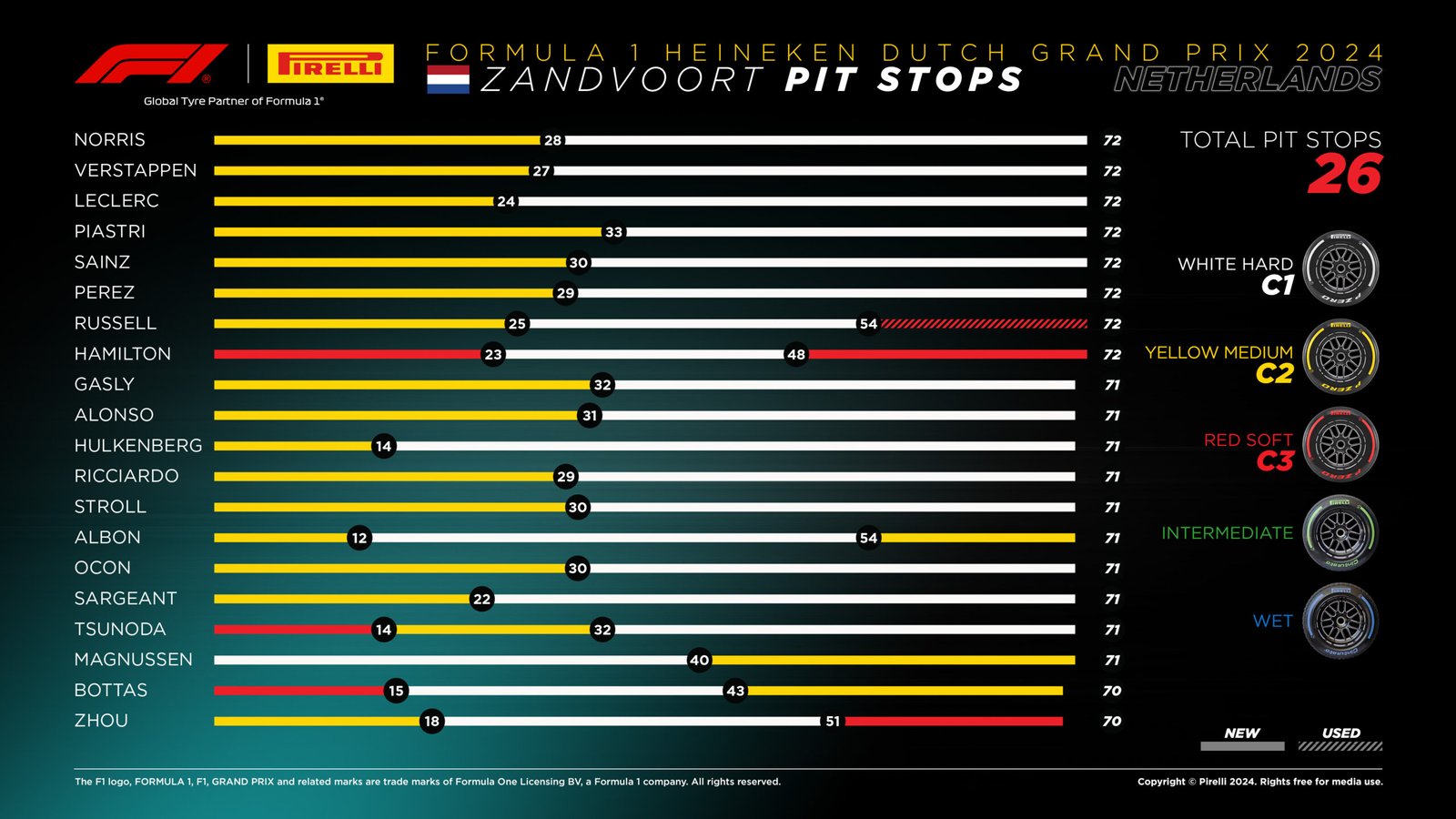 No GP da Holanda de 2025, a estratégia predominante foi a de apenas uma parada, com a maior parte dos pilotos largando com pneus médios (C3) e seguindo para o stint final com os duros (C2). Apenas alguns nomes optaram por caminhos diferentes: Hamilton, Tsunoda e Bottas começaram com os macios (C4), enquanto Magnussen largou dos boxes com os duros. A Mercedes foi a equipe que mais se afastou do padrão, escolhendo uma corrida de duas paradas – Hamilton utilizou dois stints de médios e Russell apenas um, ambos combinando com outros compostos.
