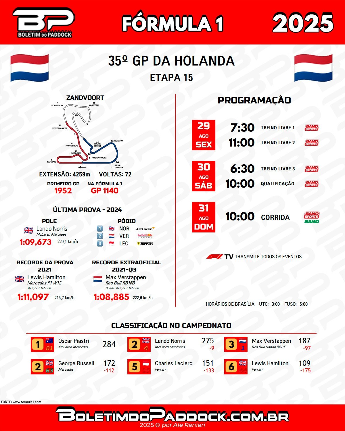 A gestão dos pneus é outro fator crucial: as inclinações e forças de até 5g em pontos como as curvas 1, 7 e 11 aceleram a degradação, especialmente a térmica. O clima também tem papel decisivo, já que a região costeira da Holanda é marcada pela instabilidade — mudanças bruscas de temperatura e vento podem transformar completamente as condições da pista de um dia para o outro.