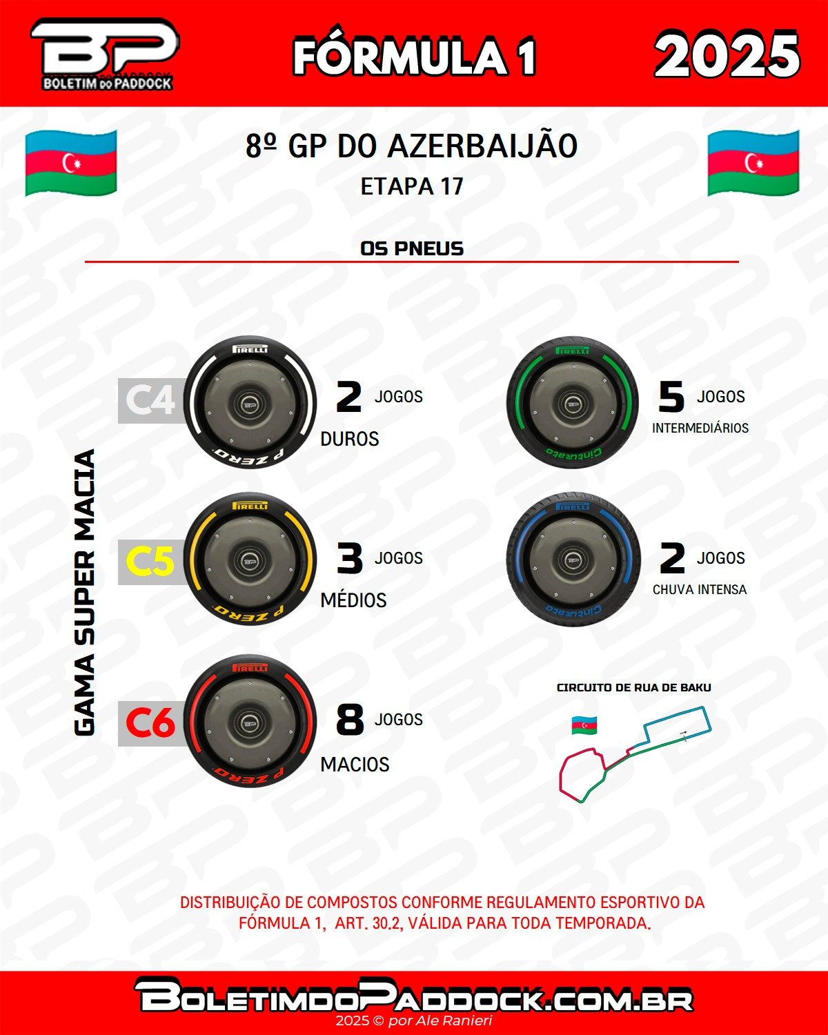 O traçado urbano de Baku impõe desafios extras, como a mudanças de temperatura e incidência de luz alteram o comportamento da borracha, enquanto as longas retas resfriam os pneus e as curvas estreitas exigem máxima aderência. A evolução da pista ao longo do fim de semana será favorecida pela presença da Fórmula 2, mas o asfalto volta a ser usado pela cidade entre as sessões.