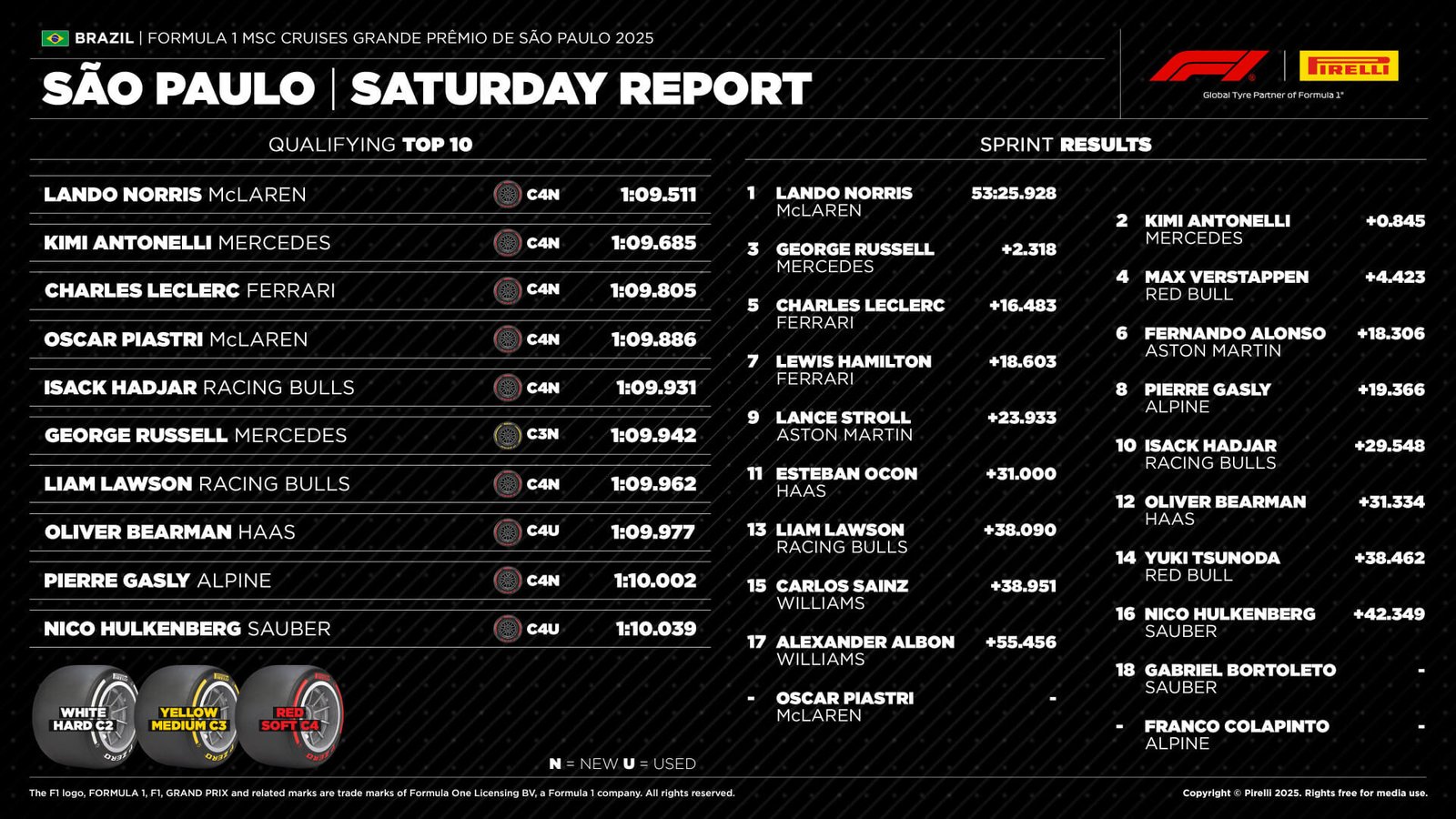 Para ter pista livre e controle do S do Senna, Norris conseguiu colocar o seu carro na posição de honra na sexta-feira. No sábado, quando a Sprint aconteceu, o asfalto estava úmido, mas as equipes com expectativa de que a pista secaria no decorrer da prova, enviaram todos os seus pilotos equipados por pneus de pista seca.