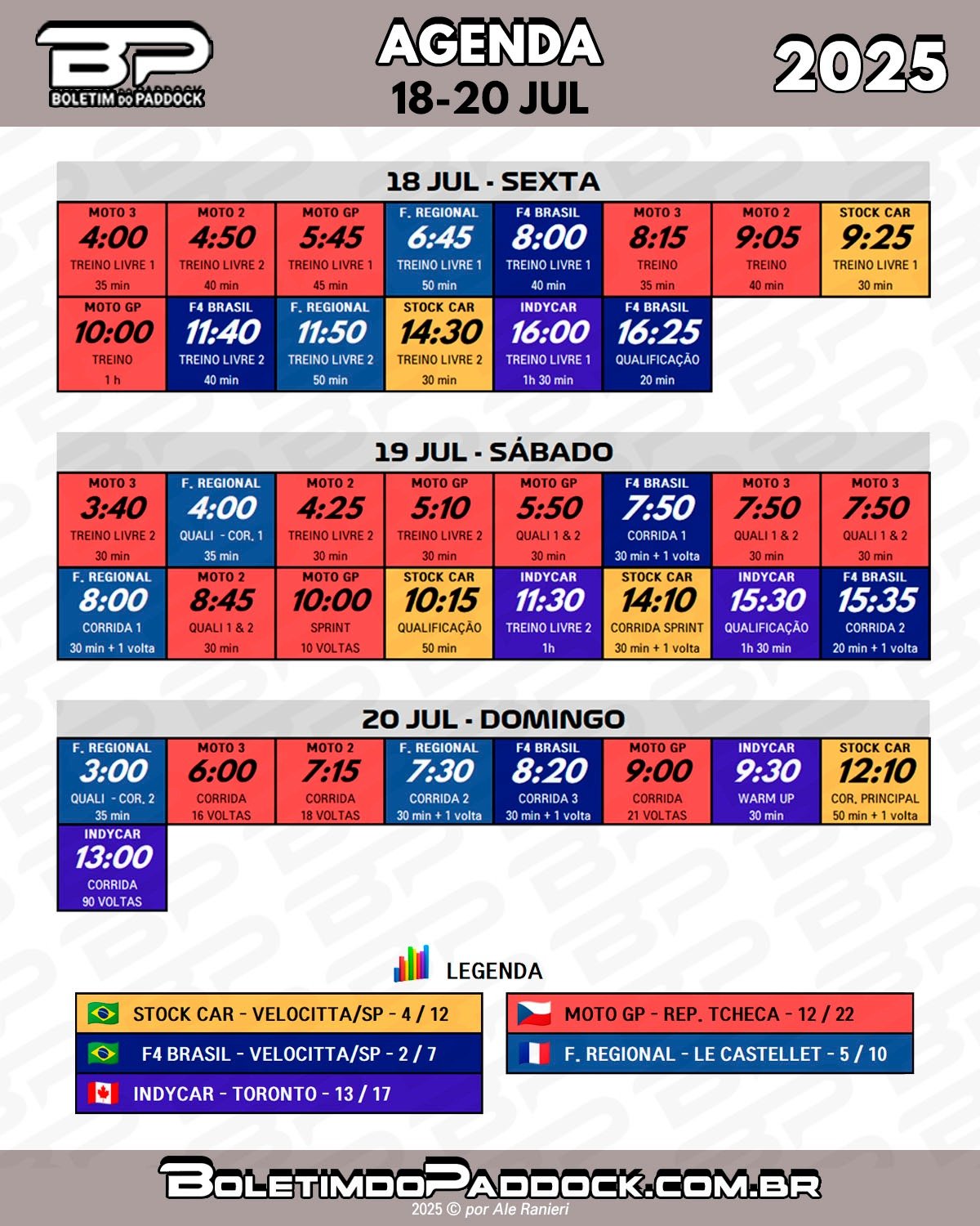 No sábado (20), a Stock Car Pro Series entra em cena com a definição do pole position às 10h15, seguida da Corrida Sprint às 14h10. O sábado ainda contará com outras sete provas, totalizando oito largadas ao longo do dia.